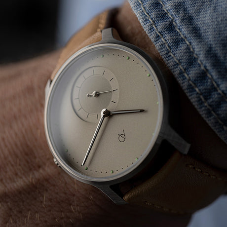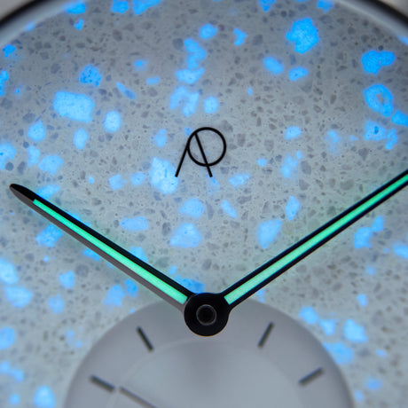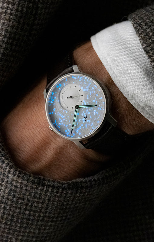 Our Astro 38 watches feature a distinctive hand-casted composite luminous stone dial. The top layer of each dial is made from an non-solvent composite, carefully cut and polished into a thin layer.